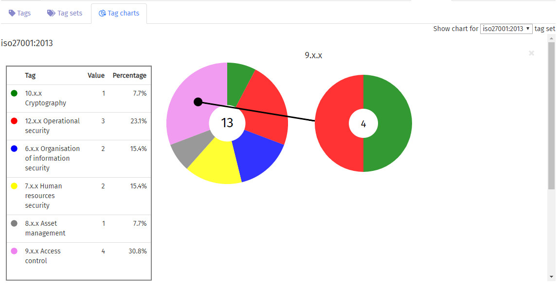 Some tag sets, with large numbers of tags, will split the charts into groups of tags. The ISO27001 tag set does this, and will show one chart segment for each of the 14 clauses in the control set, and aggregates each of the individual controls within these clauses. Moving the cursor over a segment will show the clause number and the name of the clause, for example, 8.x.x Asset management. Clicking on these segments will create a separate pie chart showing the tag distribution within this clause. The diagram below shows this for the Access control clause, which contains four tags. The right-hand pie chart shows that there are two tags in use in this clause, and each is used twice (as they each have 50% of the pie chart).