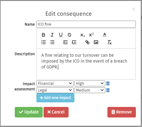 Removing an item will not delete it from the system, so if you need to move an item (e.g., a consequence) from one risk to another, it will still be found in the drop-down list when its name is typed into the Add consequence dialogue box on the node to which it is to be added.