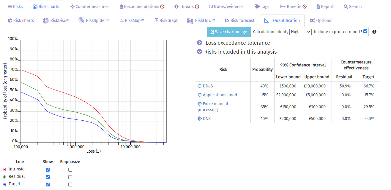 The main risk quantification graph is found on the Quantification tab on the Risk charts tab. The chart can take a few minutes to calculate. The risks that have been used in the calculation are shown in the table to the right.