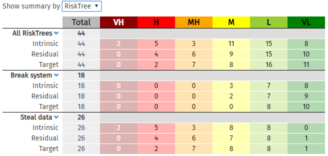 The risk summary provides a breakdown of your assessed risks by risk type (intrinsic / residual / target) and by RiskTree (if you have loaded multiple trees into the Processor).