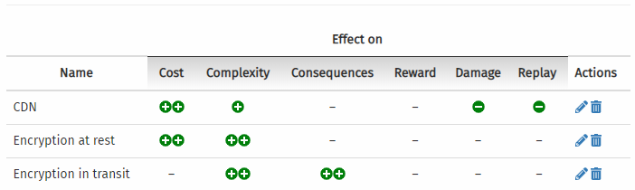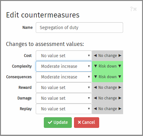 To edit an existing countermeasure, click on the blue pencil icon () in the Actions column for the appropriate countermeasure. This will open the editor box, as described above, but pre-populated with the details of the chosen countermeasure.