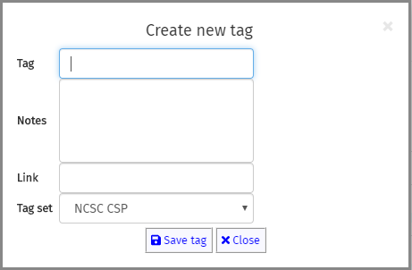 The tag set drop-down will contain a list of tag sets that have been loaded or created. Choose the appropriate set, and then click Save tag to save the new tag into the chosen tag set, or Close to lose your changes